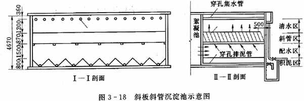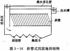斜管斜板式沉淀池的結(jié)構(gòu)與一般沉淀池相同,是由進(jìn)口、沉淀區(qū)、出口與集泥區(qū)四個(gè)部分組成,只是在沉淀區(qū)設(shè)置有許多斜管或斜板。圖3-16為斜管式沉淀池的典型結(jié)構(gòu)。