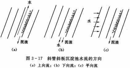 在斜板斜管沉淀池中,按照水流流過(guò)斜板的方向,可分為上向流、下向流和平向流三種,如圖3-17和圖3-18所示。水流由下向上通過(guò)斜管或斜板,沉淀物由上向下,它們的方向正好相反,這種形式稱作上向流(也稱異向流)。水流向下通過(guò)斜管或斜板與沉淀